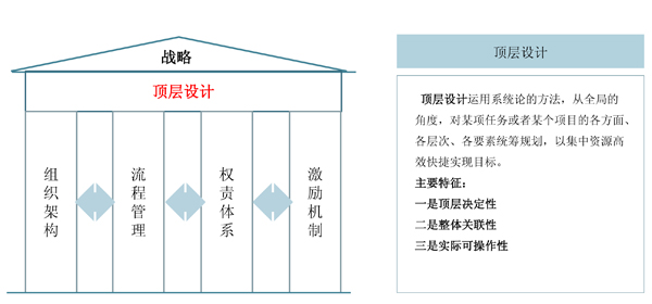 頂層設計是一個系統(tǒng)工程,涵蓋戰(zhàn)略、組織、流程和制度等多種組成部分,管理模式的變革是建立在頂層設計之上。
