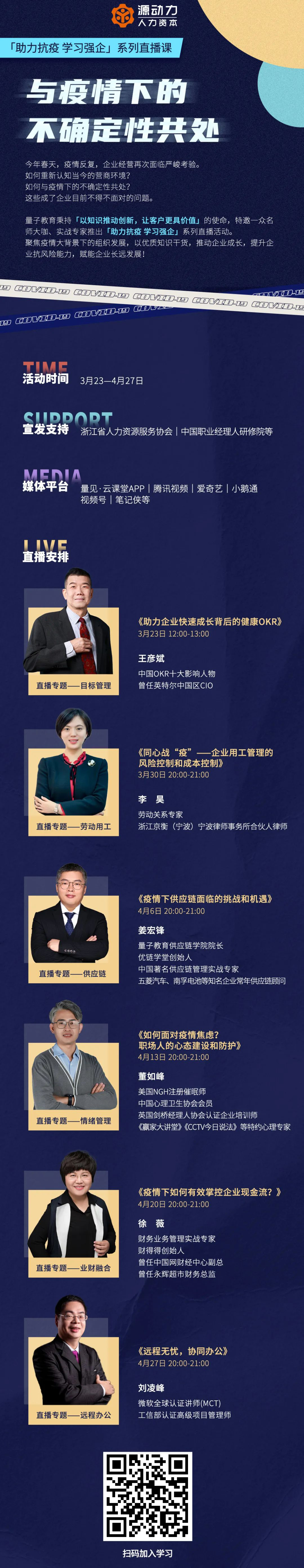 量子教育攜手一眾名師大咖、實戰(zhàn)專家聚焦疫情大背景下的組織發(fā)展,推出「助力抗疫 學(xué)習(xí)強企」系列直播活動,通過企業(yè)目標(biāo)管理、情緒管理、勞動用工、業(yè)財融合、遠程辦工、供應(yīng)鏈等多個維度提升企業(yè)抗風(fēng)險能力,賦能企業(yè)長遠發(fā)展!